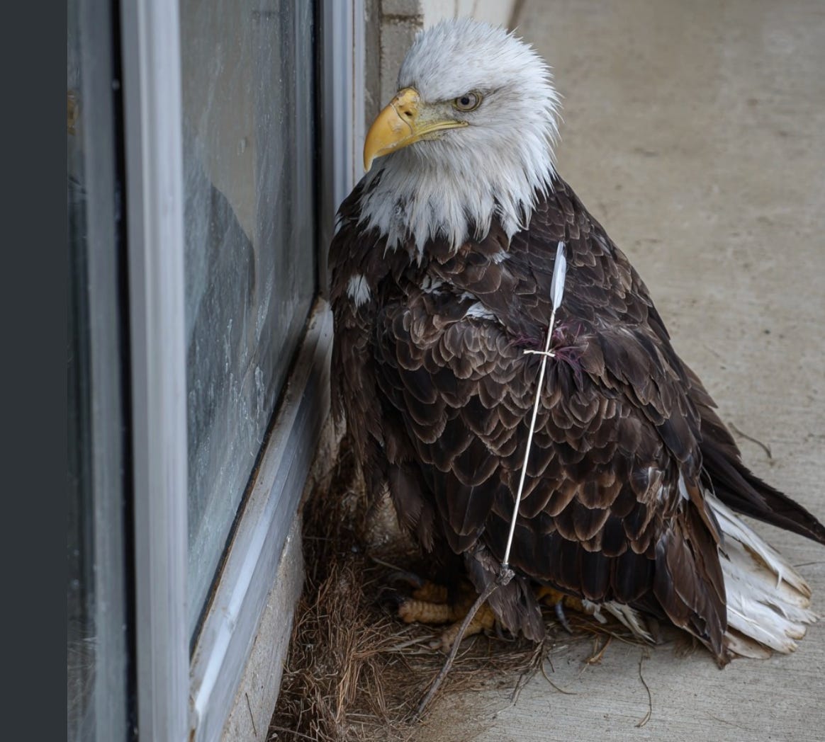 An injured, fully grown bald eagle was found at the door of wildlife rehab center in British Columbia. It remained unmoving and quiet, and peered into the glass door. A broadhead hunting arrow was embedded in its back and blood loss was evident.